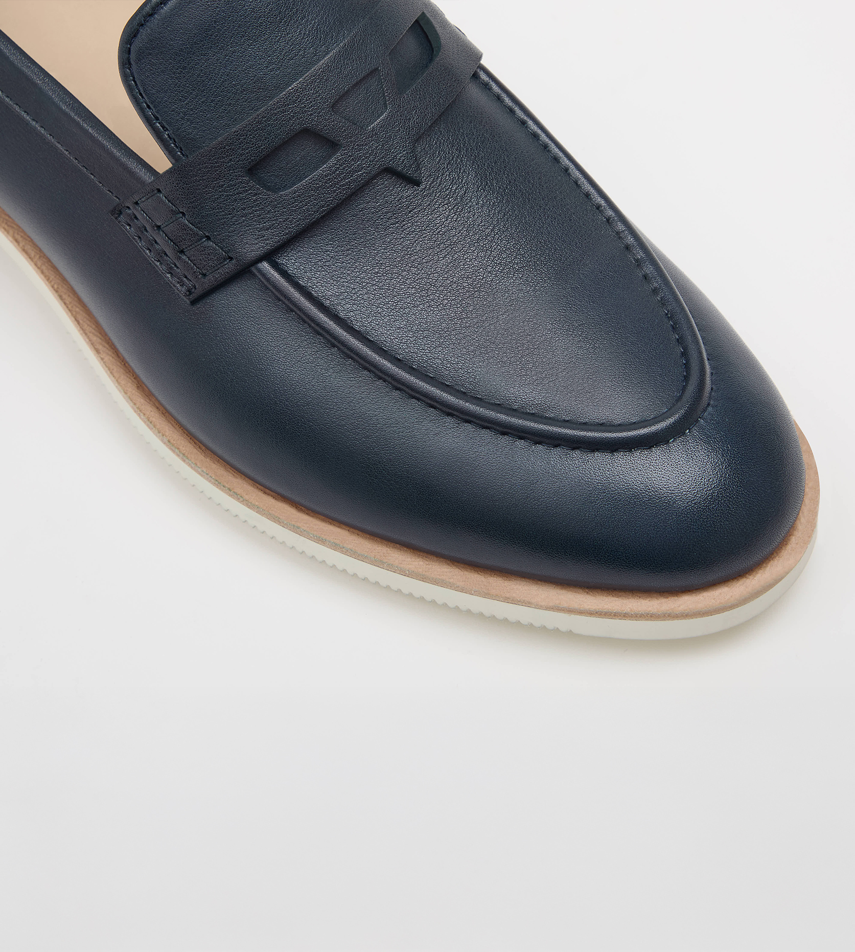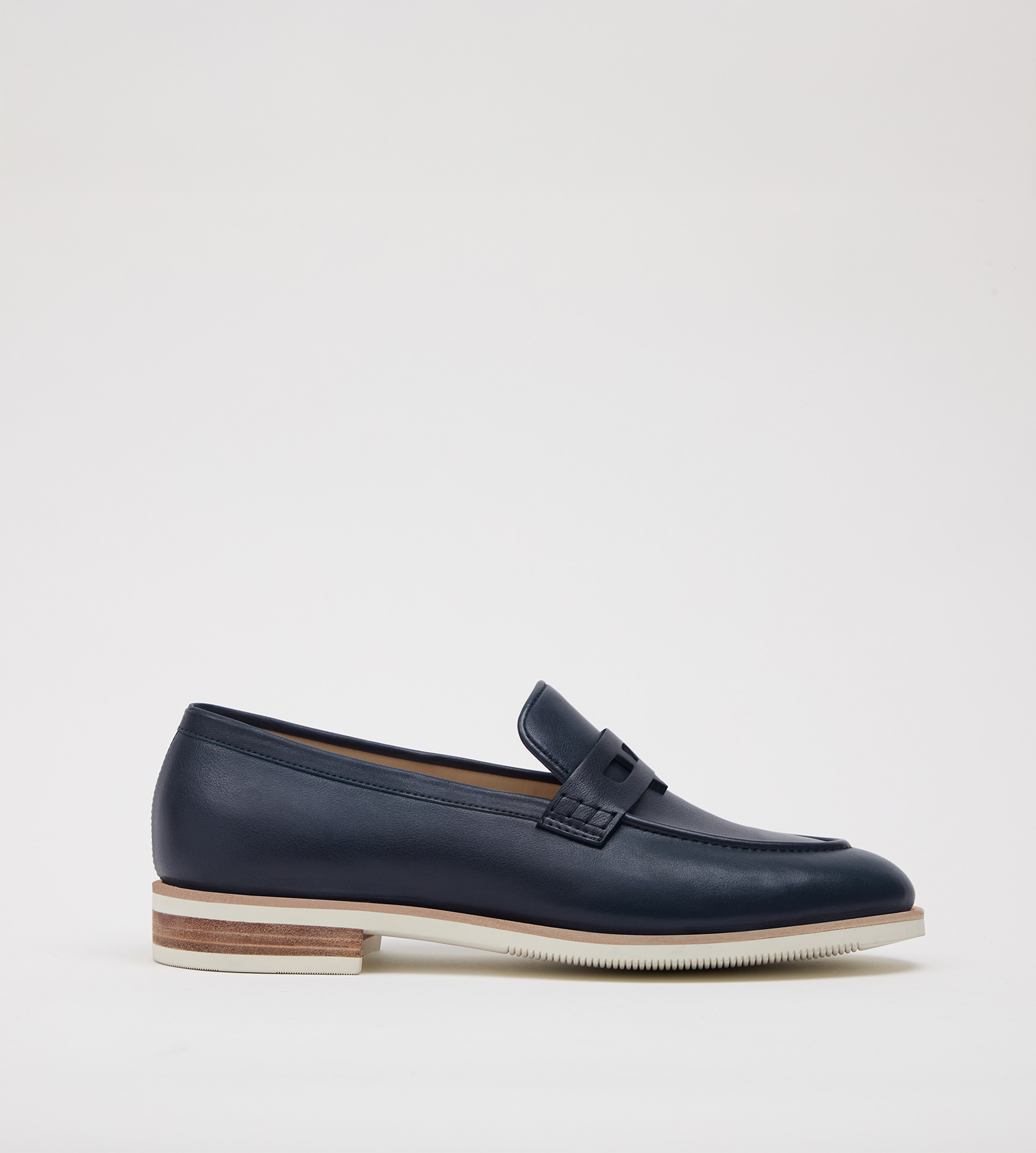 Classic penny loafer constructed by hand with a special ‘Vogel’ saddle strap. Upper entirely built with Italian milled calf leather in a deep blue hue. Sewn with American made bonded nylon tonal thread. Double stitched back seam and traditional moccasin stitch in the vamp. Hand stitched accents on the saddle. Lining made from a buttery Italian calfskin with a sueded internal heel counter. Leather sock lining with custom blue foil stamping on the heel. Blake construction with a natural calfskin midsole and a proprietary cream Goodyear rubber ripple outsole and heel with the ‘Vogel Blue’ branding. Stacked leather heel with a cream rubber ‘Vogel’ outsole.