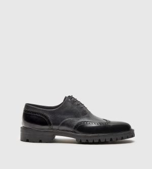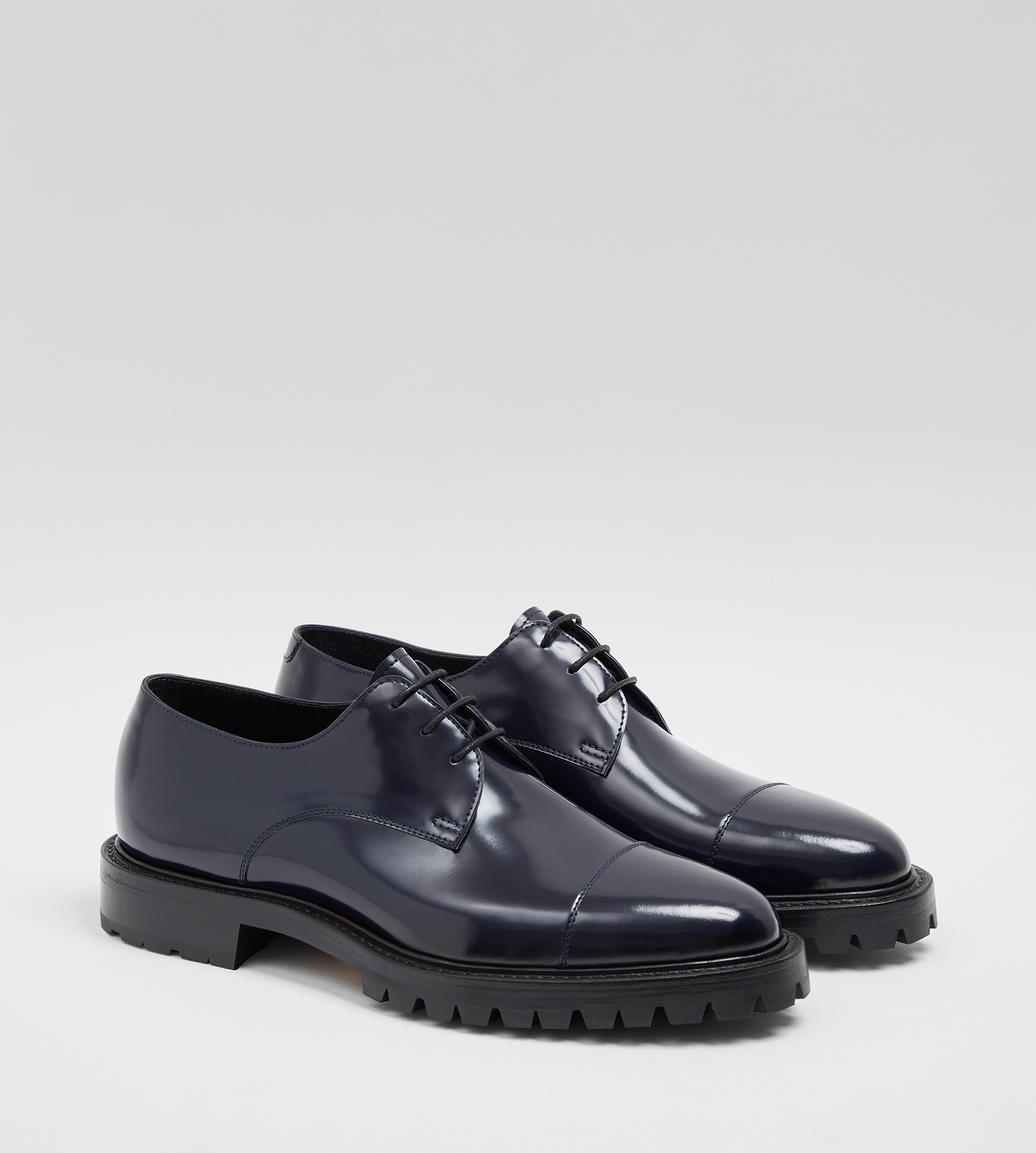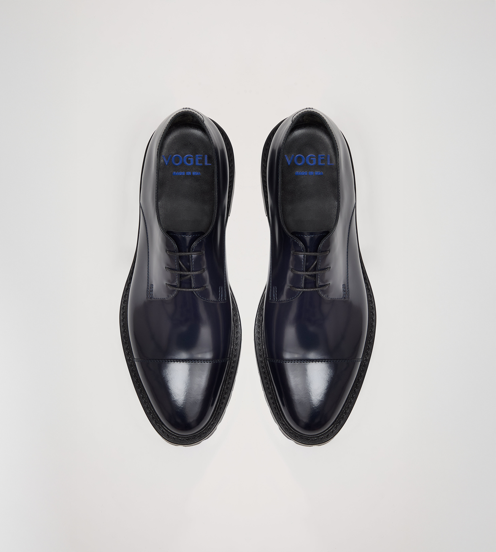 Constructed with an incredible brushed Italian calf upper in Navy. Contrasted with a black leather lining and black waxed round laces. We gave this shoe a hand welted 360-degree storm welt and finish the model with a Vibram lug sole. Stacked leather heel with a Vibram rubber top lift.