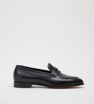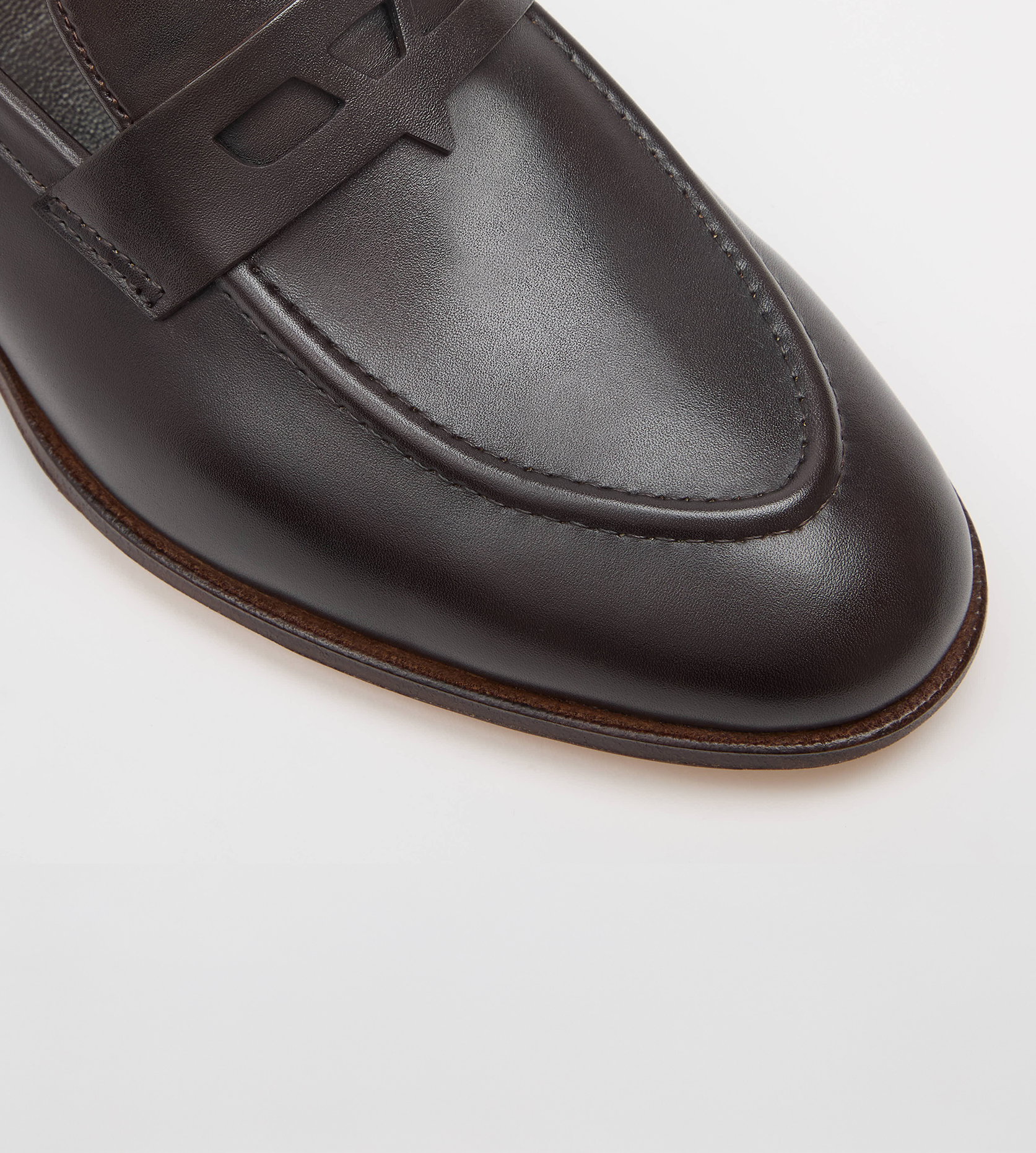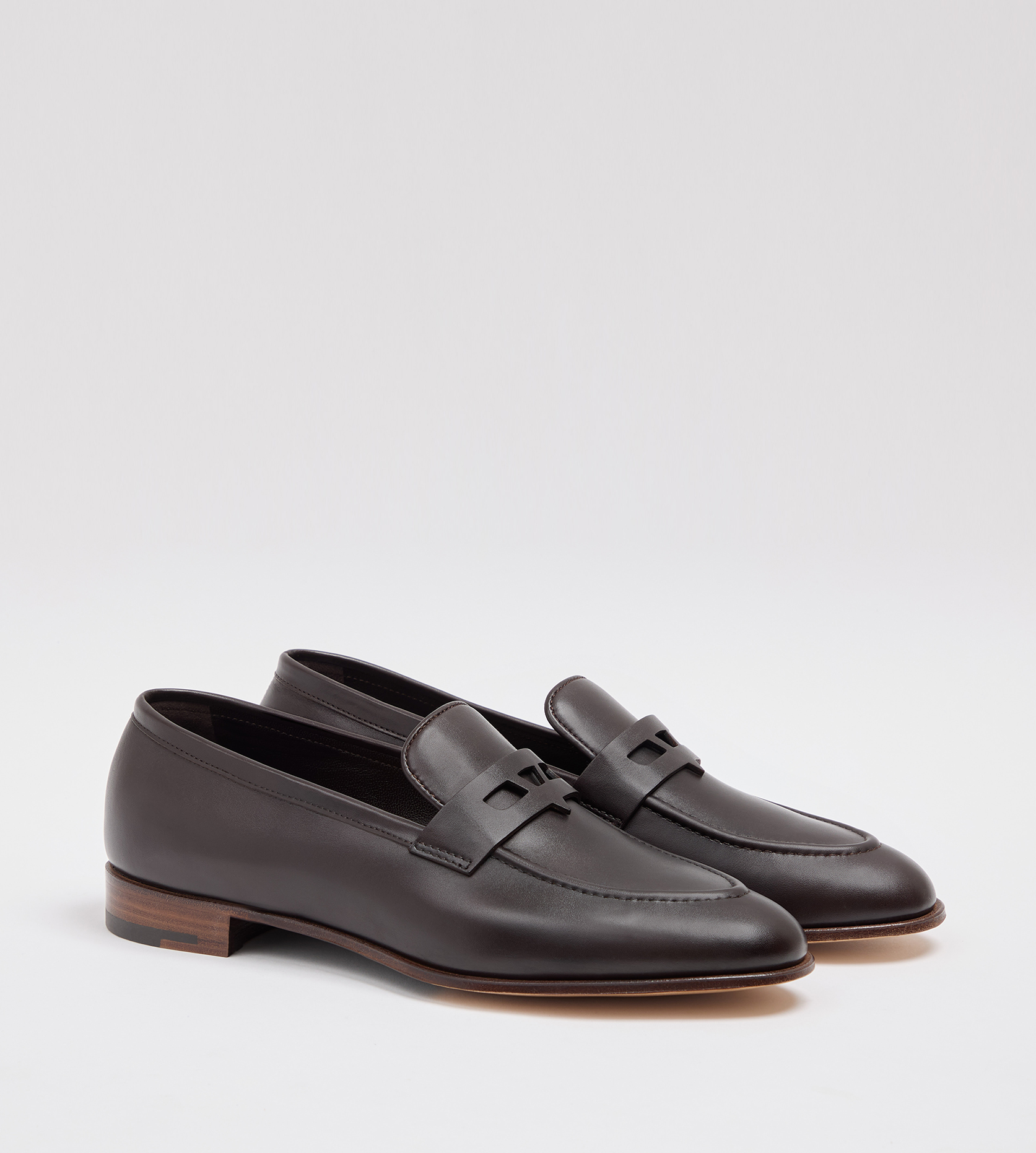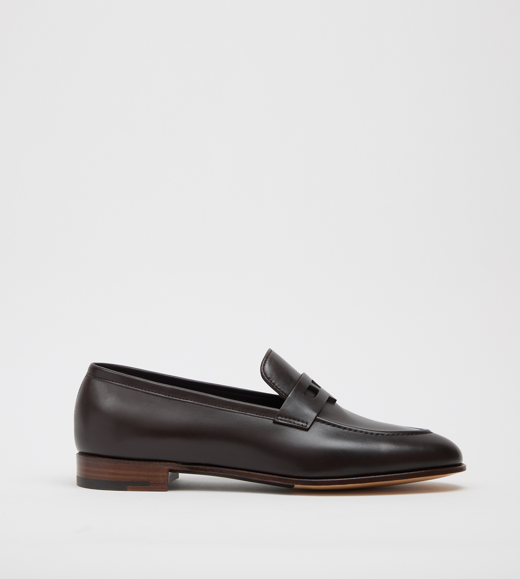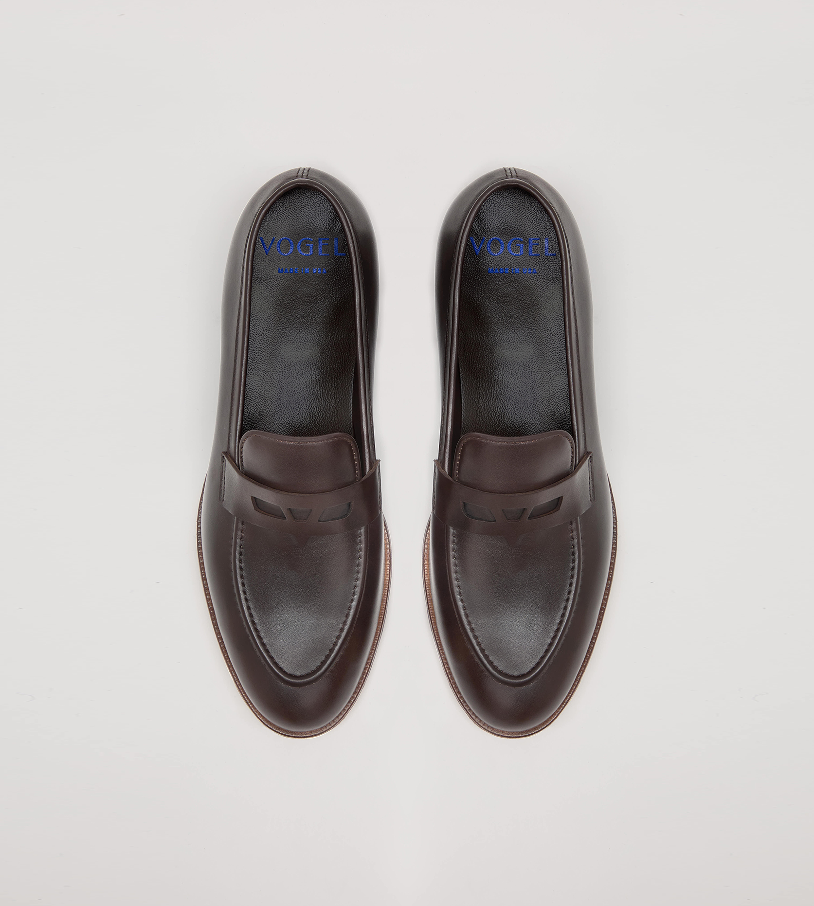 Classic penny loafer constructed by hand with a special ‘Vogel’ saddle strap. Upper entirely built with luxury grade brown, smooth grain Italian calfskin. Sewn with American made bonded nylon tonal thread. Double stitched back seam and traditional moccasin stitch in the vamp. Lining made from Italian goatskin with a sueded internal heel counter. Leather sock lining with custom blue foil stamping on the heel. Luxurious hand painted leather sole with split stacked leather heel. Blake construction for a light weight and durable finish.